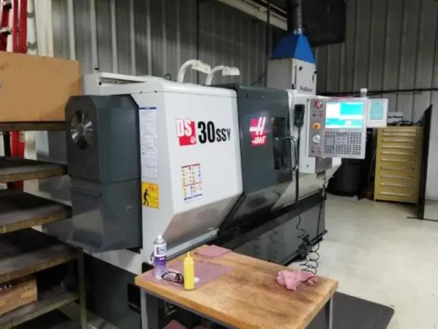 THIS 2014 HAAS DS-30SSY IS A DUAL SPINDLE LATHE WITH Y AXIS WITH 8" CHUCK, 3" BIG BORE OPTION, 300 PSI COOLANT THRU, CHIP CONVEYOR AND A BUNCH OF TOOLING.