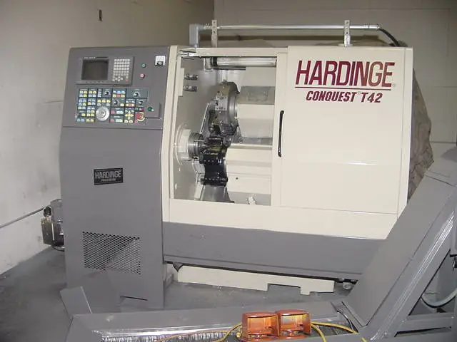 THIS HARDINGE CONQUEST T-42 CNC LATHE with LIVE TOOLING AND 6 POSITION END WORKING TURRET HAS AN 8" POWERHOLD CHUCK AND 16C COLLET, 12 POSITION UPPER TURRET WITH 6 LIVE STATIONS.