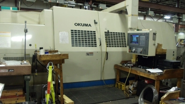 THIS OKUMA LB 45-II HAS 80" CENTERS, AN 18" KITAGAWA CHUCK WITH A 4.33" SPINDLE BORE AND SPEEDS OF 2800 RPM'S.