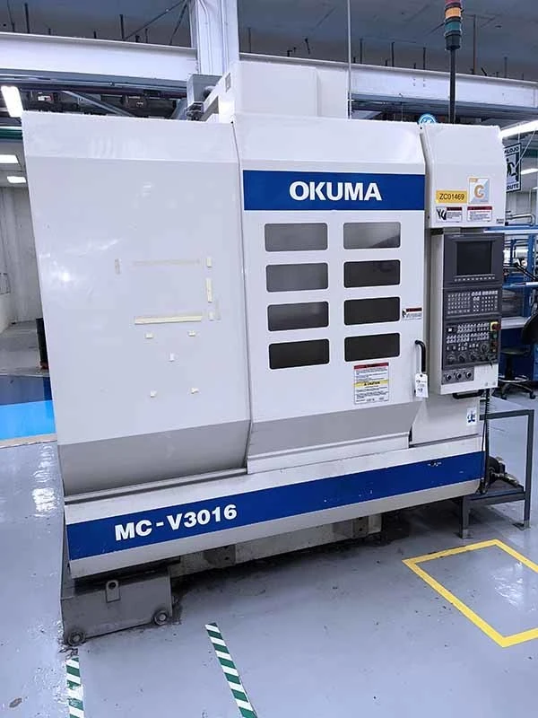OKUMA MC-V3016 WITH: OSP-E100M CNC CONTROL HAAS INDEXER AND CONTROLLER, AIR ACTUATED VISE, COMPOUND VISE, ASSORTED TOOLHOLDERS, AND CHIP CONVEYOR.