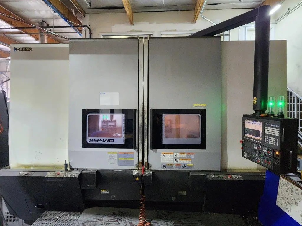2013 OKUMA 2SP-V80 HAS (2) 32" 3-JAW CLOSED CENTER CHUCKS, CHUCK ADAPTOR, A2-11, SEALED UNDERNEATH, TOUCHSETTER QTS MAN/AUTO (BOTH), DRAWBAR, HPC UNIT 1000 PSI, SPARE M CODES 4 SETS, AND GUIDE BUSHING SUPPORT.