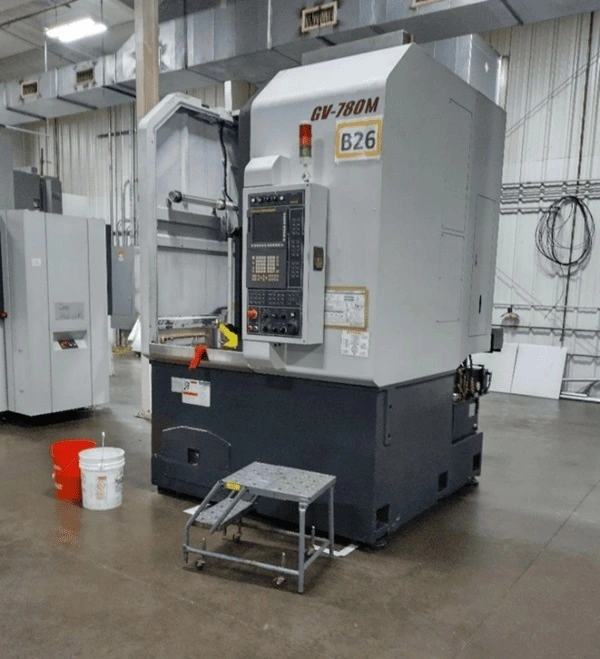 2017 Yama Seiki GV-780M VTL with live tooling and Fanuc control. Key specs: 32.2" table, max swing 33.4", turning dia. 32.2", height 25.9". Features include 24" SMW QT chuck, coolant tank, oil skimmer, Renishaw probe, and live tool holders.