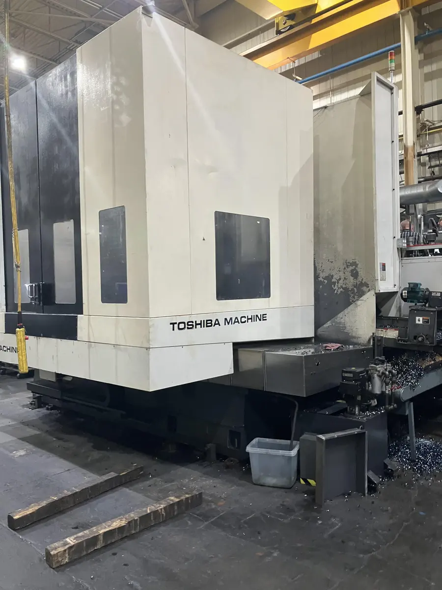 2011 TOSHIBA BTH 110 R18 CNC Horizontal Boring Mill with 4.3" spindle, 100" X-axis, 80" Y-axis travel, 60 hp, 4000 RPM. Features a 55" x 71" table, 20" spindle travel, and CAT #50 taper. Includes chip conveyor, coolant, chiller unit, and platform.