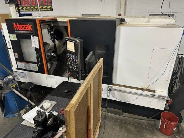 Used 2014 MAZAK QTN 350MY II CNC Lathe in excellent condition. Features 29.5" max swing, high-pressure coolant system, and advanced MAZATROL MATRIX 2 control. Tool capacity includes 12 turret positions with 4,000 RPM rotary tool speed. Equipped with chip conveyor and mist collect system for optimal operation.