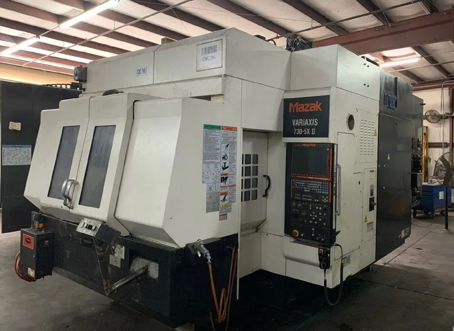 2011 MAZAK VARIAXIS 730-5X II, vertical machining center with 5-axis tool tip control, synchronized tapping, 10000 rpm spindle speed, and 40-tool ATC. Features MAZATROL MATRIX control, dual belt conveyor, and trunnion table. High-pressure coolant system included.