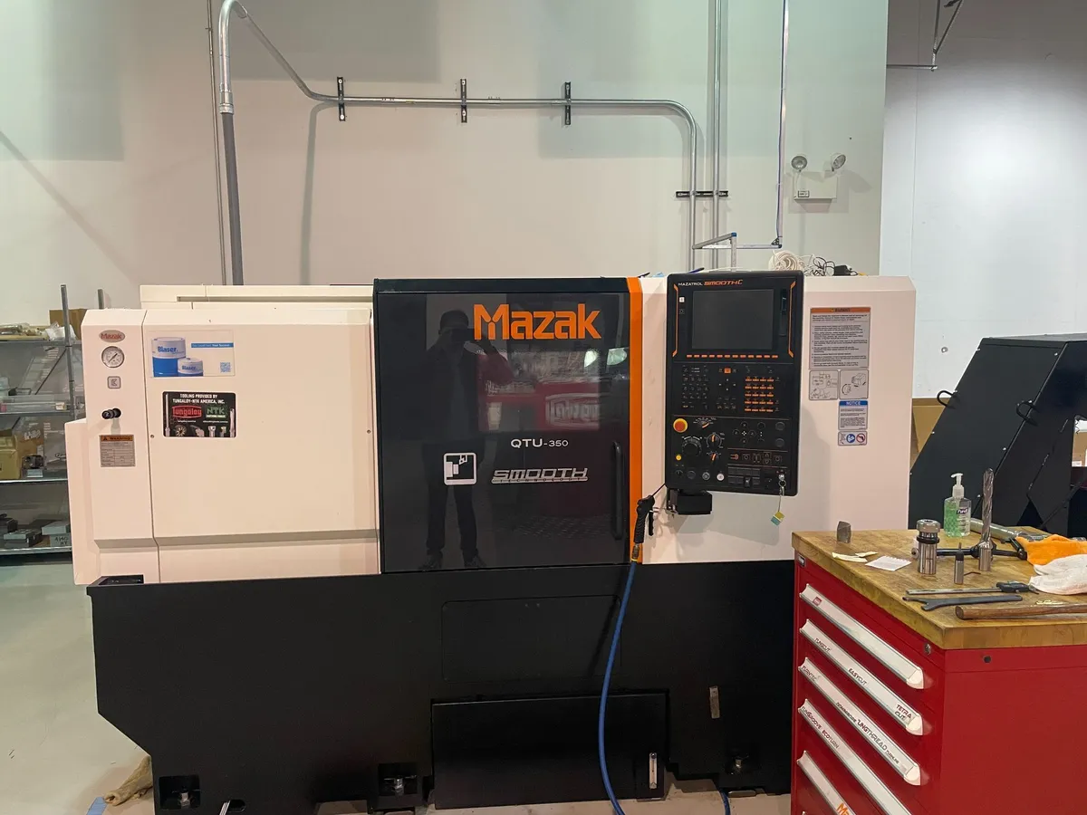 2017 MAZAK QTU 350 CNC Lathe with MAZATROL SMOOTH C, automatic tool eye, chip conveyor, and 10" 3-jaw chuck. Features 27.4" max swing, 23.75" Z travel, 3500 RPM spindle speed, programmable tailstock. Includes manuals and tooling.