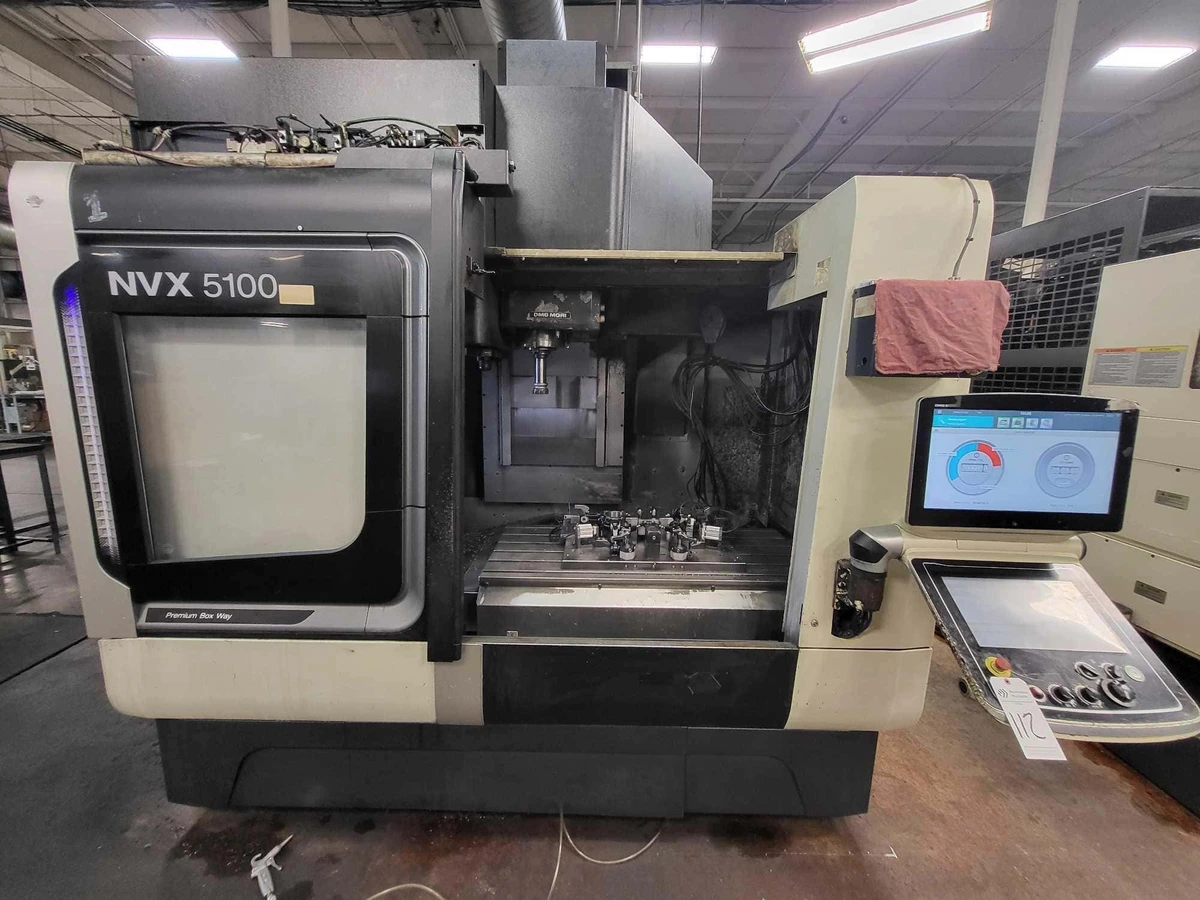 2015 DMG MORI NVX 5100/50 vertical machining center, used. Specs: X/Y/Z Travel 41.3"/21.7"/20.1", Spindle Speed 8000 RPM, Tool Capacity 30. Features ERGOLINE CELOS, Coolant Thru Spindle, Chip Conveyor. Table 21.7" x 51.2". Main Spindle Motor 30 HP.