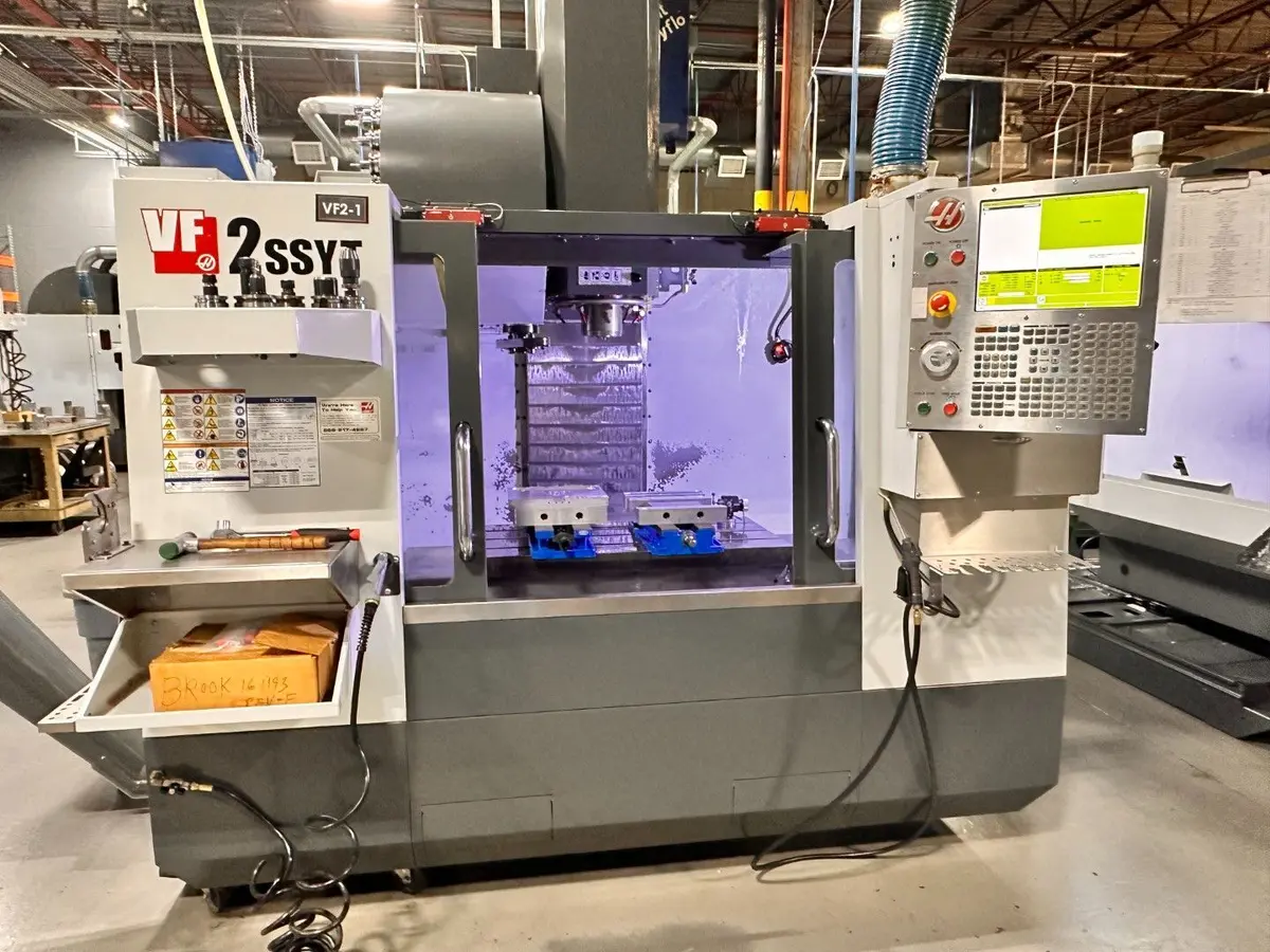 2015 HAAS VF-2SSYT vertical machining center with 30"x20"x20" XYZ travel, 12,000 rpm spindle, 24-tool ATC, and CAT 40 taper. Features HAAS CNC control, extended Y axis, 4th axis wiring, probing, Ethernet, and chip auger.