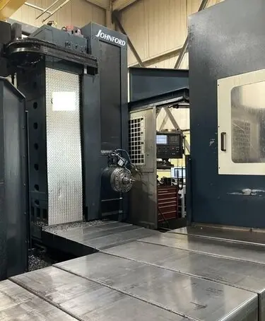 2016 Johnford BMC-110 Horizontal Boring Mill, used. Features a 62.99" x 55.1" table, spindle speed of 3,000 RPM, and CAT 50 spindle taper. Equipped with FANUC 31IMB control, full B axis rotary table, and chip conveyor. Perfect for CNC operations.