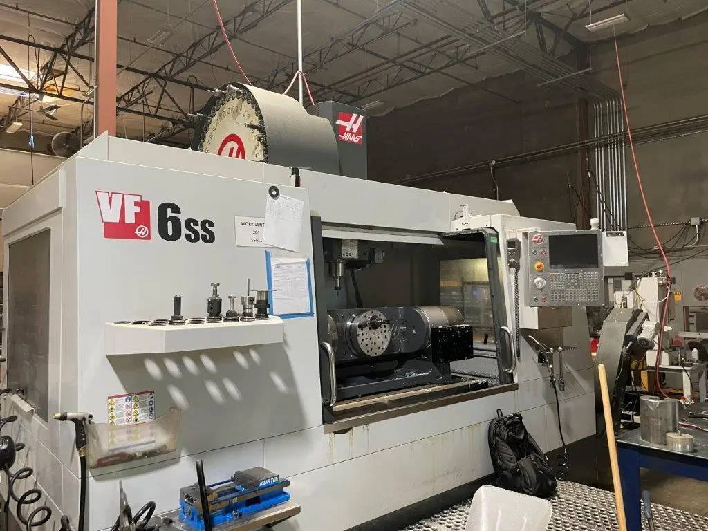 2014 HAAS VF-6SS 5-Axis, fully equipped with HAAS CNC control, TR310 trunnion, 5th axis drive, chip conveyor, and high-pressure coolant system. Offers 64"x32"x30" travel, 12000 rpm spindle, 24-tool ATC, and a robust 30 hp motor.