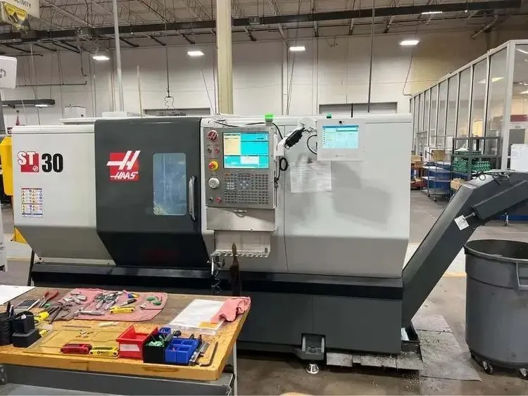 2013 HAAS ST 30T CNC Lathe with 2-axis control, offering a max swing of 31.75", 26" turning diameter, and a 10" hydraulic chuck. Equipped with HAAS CNC control, high-pressure coolant, tailstock, conveyor, and tool presetter.