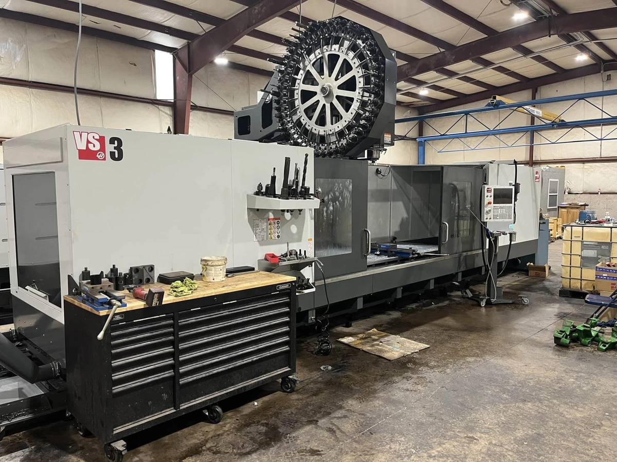 2022 HAAS VS-3 vertical machining center with 150" x 50" x 50" travels and 10,000 rpm spindle speed. Equipped with 51-tool capacity, CAT 50 taper, through-spindle coolant, 4th-axis drive, wireless probing, and HAAS Next Gen Control. Ideal for precision tasks.