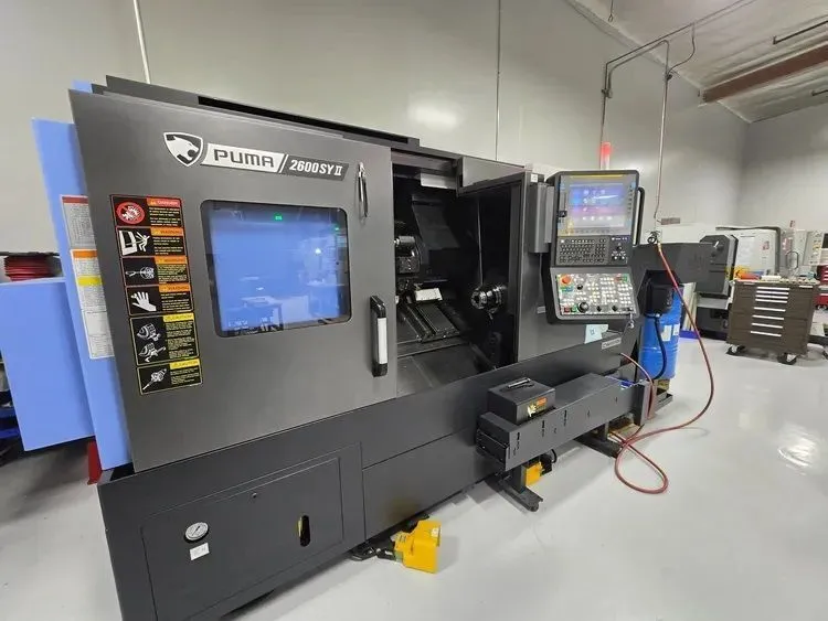2022 Doosan PUMA 2600SY II CNC turning center with Y-axis & sub, featuring 14.8" swing, 29.9" max diameter, 10" & 8" chucks, FANUC 0i Plus control, low hours, includes 8 live tools, chip conveyor, and parts catcher. Buyer to verify specs.