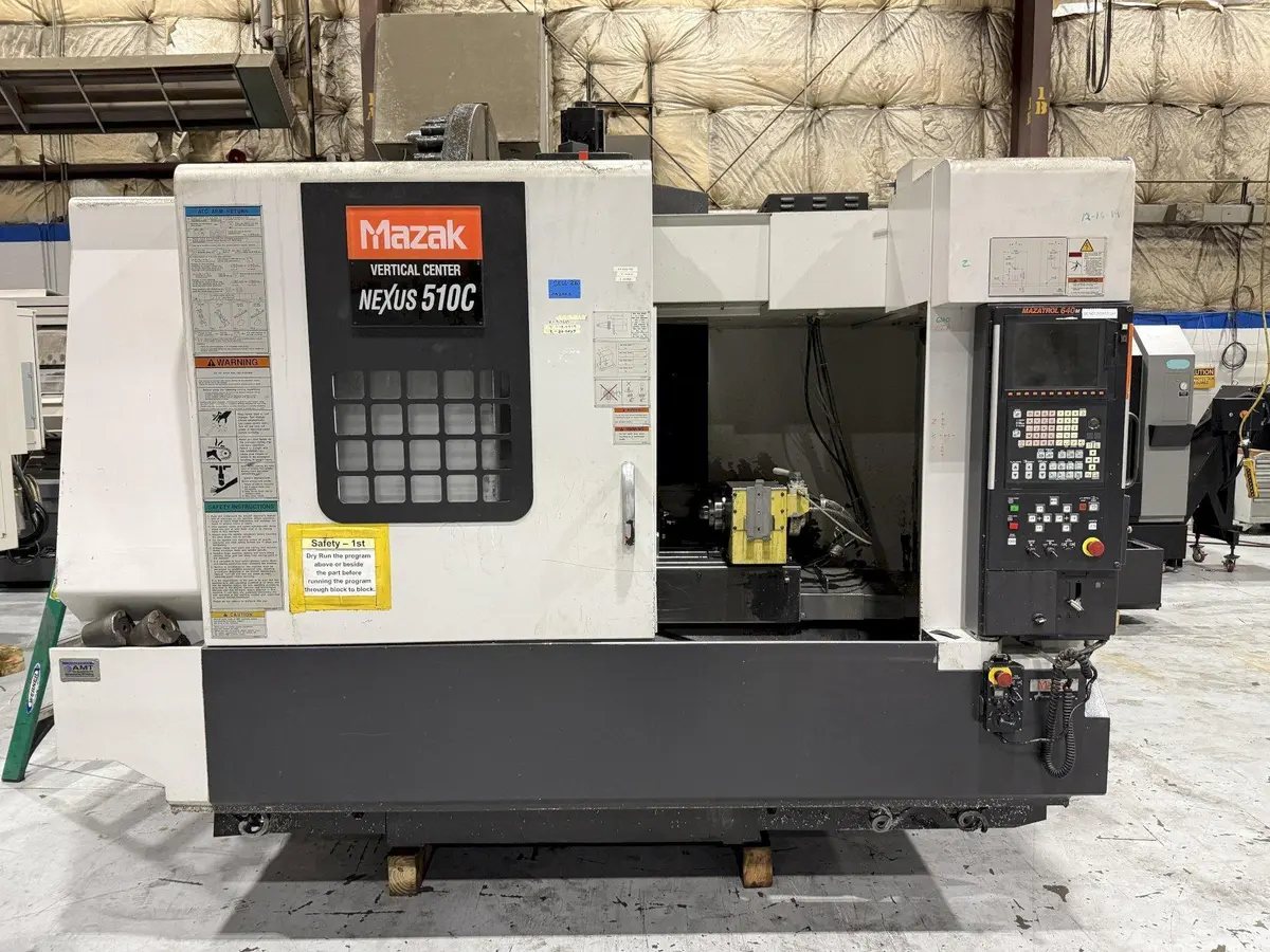 Used 2006 MAZAK NEXUS VCN-510C II Vertical CNC Machining Center. Features 41.34" X, 20.08" Y/Z travel, 12000 rpm spindle, 30-tool ATC, and Mazak CNC Control. Equipped with Nikken 4th axis, coolant thru spindle, synchronized tapping, and chip conveyor for optimized efficiency.